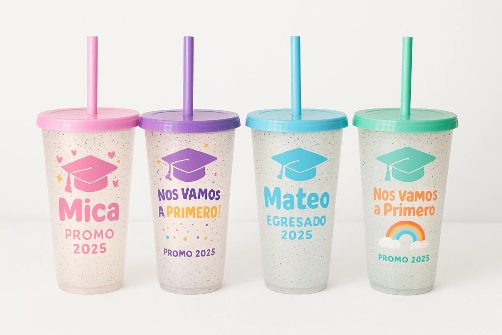 Vaso plástico glitter 550cc con tapa plana y sorbete de color (13 cm x 6 alto) y sticker personalizado para egresados, sin packaging
